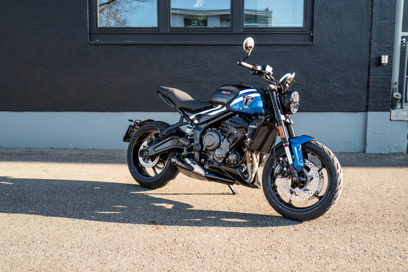 TRIDENT 660 - PURER FAHRSPAẞ GARANTIERT Leistungsstarker Dreizylindermotor, erstklassige Technik und Ausstattung zu einem absolut konkurrenzfähigen Preis. Die Trident 660 punktet vor allem mit den Vorteilen eines Dreizylindermotors, ist besonders sportlich, stilvoll und agil und überzeugt durch ihren konkurrenzfähigen Preis. Im Angebot ist unsere Demo Trident 660. Diese hat unsere Custom Crew etwas verschönert… Als erstes fallen die schwarz gepulverten Fussrasten und Auspuffblenden ins Auge. Diese verleihen der Trident den schönen «two tone» Effekt und harmonieren perfekt mit dem schönen Blau. Optisch haben wir die Trident mit teilen aus dem Triumph Zubehör aufgerüstet, Lenkerendspiegel, LED-Laufblinker, Sturzprotektoren sind mit an Bord. Der Flyscreen und der der Bugspoiler in Fahrzeugfarbe runden das gesamt Paket ab. Die Pro Brake Brems-. / Kupplungshebel sind natürlich eingetragen. Hinzu kommt die grosszügige Ausstattung der Trident mit Quickshifter, Tempomat und Connectivity. Auf Wunsch auch als 35KW Version erhältlich. Die Trident hat bis Februar 2027 Werksgarantie. Wer auf Nummer sicher gehen möchte kann auf Wunsch eine Occasion Garantie für 12 oder 24 Monate erwerben. Der im Inserat angegeben Preis ist ohne Ablieferungspauschale in Höhe von CHF 360.- angegeben.